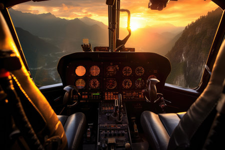 Helicopter cockpit at sunrise in the mountains with beautiful sky in the background over the mountains, Ai generated