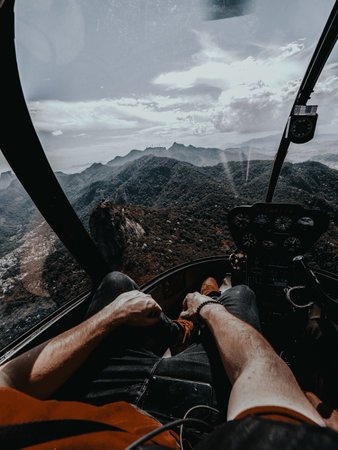 A vertical shot of a person sitting in a helicopter flying over the mountains