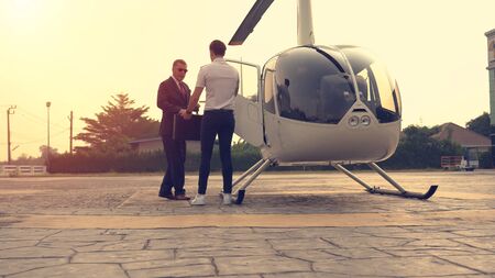 Business man and pilot talking near small private helicopter on a landing point