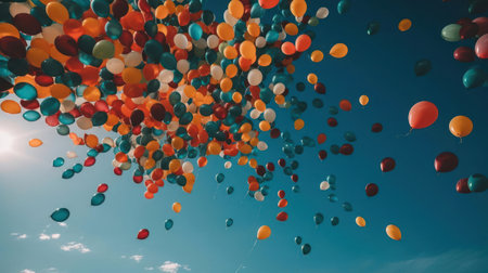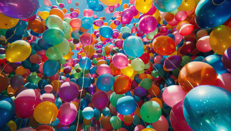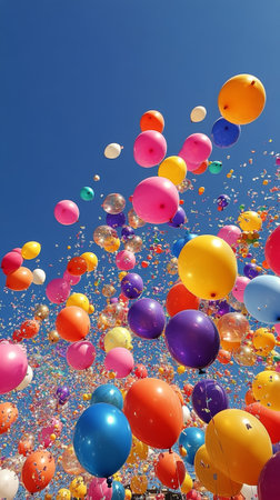 A vibrant scene of colorful balloons floating in a bright blue sky, creating a joyful and celebratory atmosphere perfect for events and special occasions.