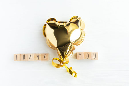 The word thank you on wooden cubes and a heart shaped balloon on a light background with space for text.