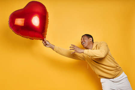 Playful mixed race man catching big heart shape balloon while standing against yellow background