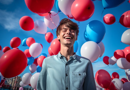 Carefree man celebrating valentines day Handsome shorthaired guy holding red balloons : Generative AI
