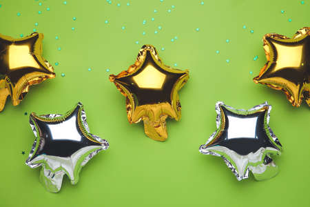 Golden confetti and multicolored balloons at the celebration on the street