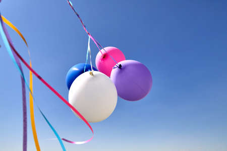 Multicolored balloons with ribbons fly in the sky against the background of a blue sky. Fly under the flow of the wind. A holiday in nature under the open sky.