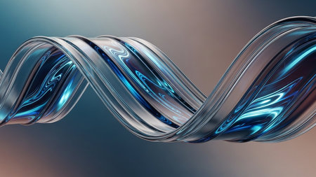 Abstract twisted metallic ribbon with a fluid motion and blue neon glow against a gradient background.