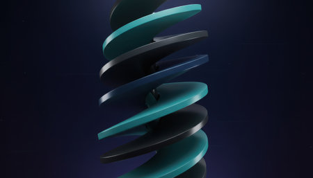 A central vertical helix rendered in vibrant teal and deep blue twists against a muted dark background. Small, luminous points dot the surface of the spiral, suggesting energy flow or digital information within a sleek, modern, and abstract technological design.