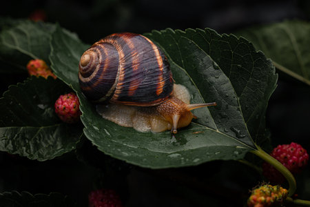 Snail on a green leaf of a mulberry tree