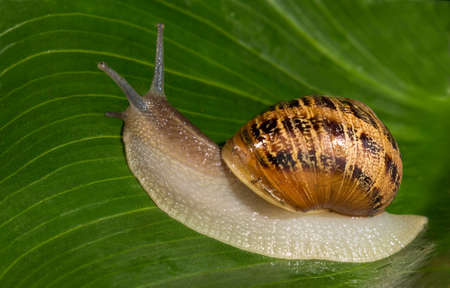 Big garden snail on a leaf background