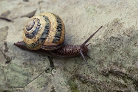 Snail hid in a brown shell. Snail on the stone. Close up photo of snail.
