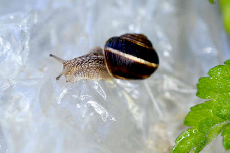 young snail on a plastic bag background.