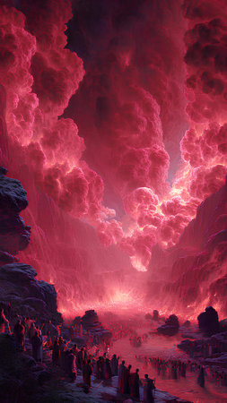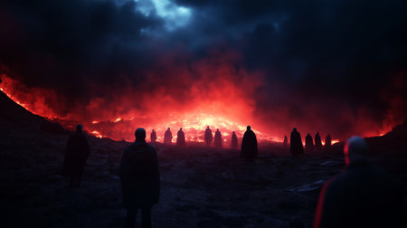 Dark silhouettes of figures walk towards a fiery glow on a volcanic landscape under a turbulent sky at dusk