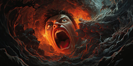 Screaming man engulfed in flames. Male face shouting in agony surrounded by fire. Suffering person