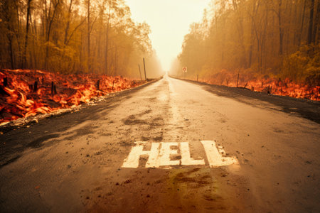 Conceptual image of a burning road with the words hell.