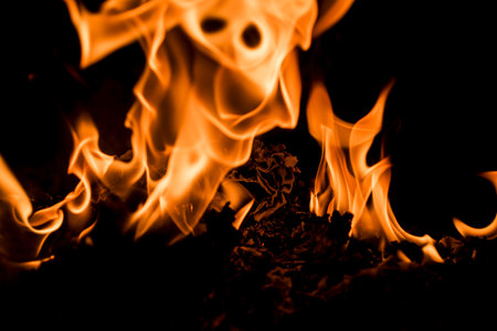 Close up burning flames on black background for graphic design or wallpaper. Red and yellow, heat energy igniting fuel during night. Abstract shaped fire used for cooking.
