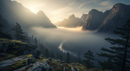 Misty morning blankets lush valley with winding river during tranquil dawn hours