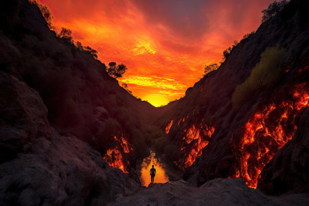 fiery canyon sunset, with a silhouette of person standing in the midst of flames, created with generative ai