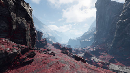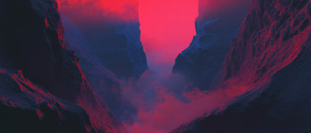 Cinematic view of a dramatic canyon showcasing vibrant rock formations and striking contrasts