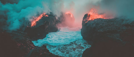 Vibrant sea landscape showcasing turbulent waves and glowing fiery elements in a mesmerizing view