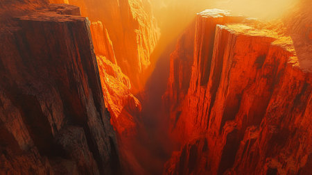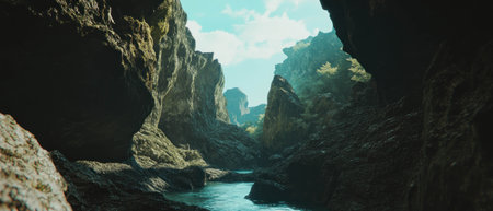 Cinematic view of a dramatic canyon with a serene river flowing below under the sunlight