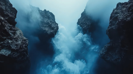 Majestic ocean waves crash dramatically between rugged rock formations, creating a stunning display of nature's power and beauty in a misty atmosphere.