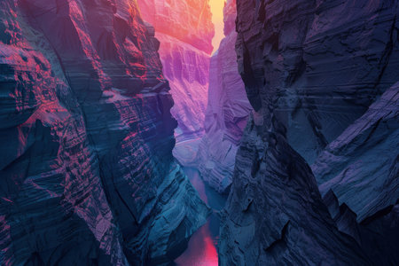 A dramatic aerial view of a deep canyon with a river running through it, the rocky walls illuminated with a soft, pink and purple glow.