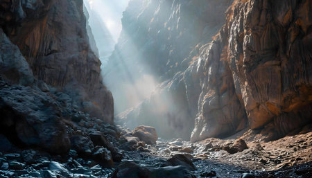 the photo showcases a stunning rock formation in a canyon, featuring gothic dark and moody tones. set against the backdrop of norwegian nature, the image captures the essence of frostpunk and site-specific artworks. with subtle atmospheric perspective, this breathtaking scene is a testament to the beauty of nature. the photo also highlights epic portraiture, leaving viewers in awe of its captivating allure. ai generated