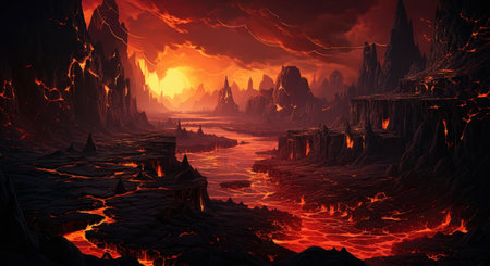 hell. Apocalyptic vision of a fiery landscape, with molten lava and a blazing sky at sunset