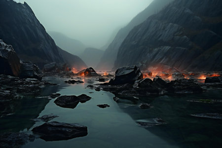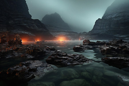 Mountain lake with burning lava and rocks in the mountains at night