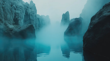 A mesmerizing view of a misty mountain lake, enveloped in fog and surrounded by striking rock formations, capturing the essence of tranquility and natural beauty.