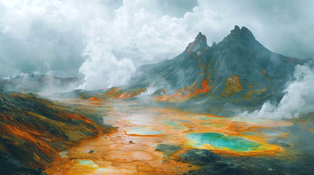 Surreal Volcanic Landscape with Multicolored Mineral Pools and Steam Vents for Nature Photography