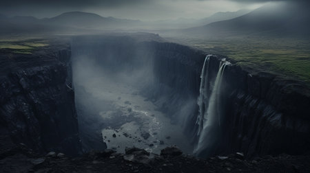 aerial view of the dark and misty tabernas waterfall, surrounded by a vast expanse. the black mist adds an eerie touch to the scene, as the dark sky looms overhead. the ground, covered in black sand, enhances the mysterious atmosphere of this captivating landscape. ai generated