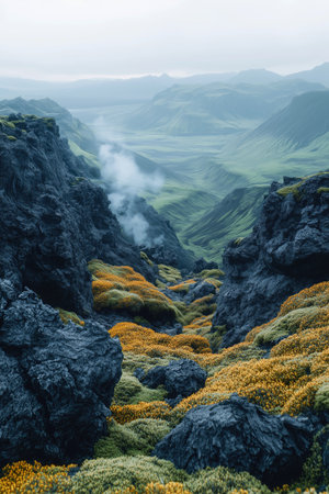 Majestic volcanic landscape with steam rising under a dramatic sky