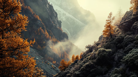 the majestic landslide, surrounded by vibrant autumn foliage, is shrouded in a mystical fog, creating a breathtakingly serene atmosphere, perfect for nature enthusiasts and photographers seeking stunning 8k wallpapers and high-resolution images of seasonal landscapes. ai generated