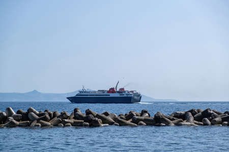 Liner ferry boat, passenger ship depart from Ermoupolis port, Syros island, Cyclades Greece. Breakwater for protection Aegean Sea, blue sky
