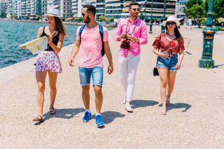 One couple is reading a map while the other is taking photos on their summer vacation.