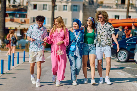 A diverse group of tourists, dressed in summer attire, strolls through the tourist city with wide smiles, enjoying their sightseeing adventure