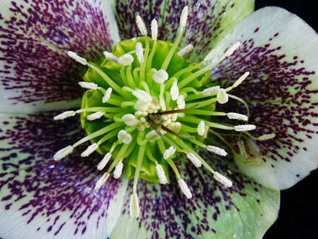 Hellebore flower with speckled petals and yellow stamens in bloom.