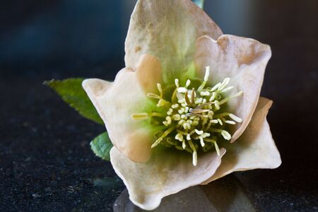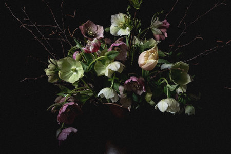 Vintage hellebores bouquet in a jug on a black background. Blur and selective focus. Low key photo. Extreme Flower Close-up