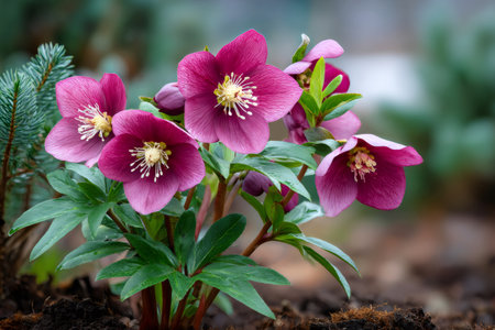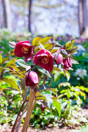 Hellebore flowers with deep magenta petals and yellow stamens growing in a spring garden