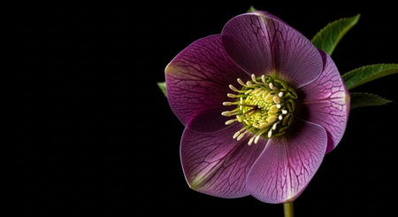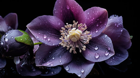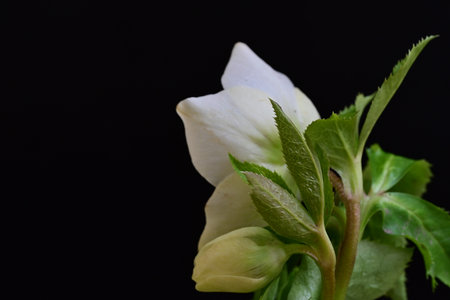 macro closeup of deep purple flower and bud with leaves of Helleborus niger, called Christmas rose black background