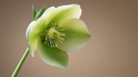 A stunning close-up of a green flower with delicate petals and intricate stamen, set against a soft brown background, highlighting nature's exquisite beauty and detail.