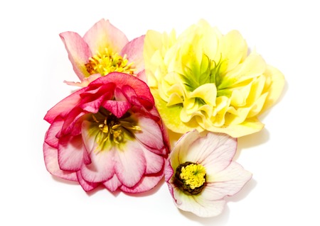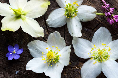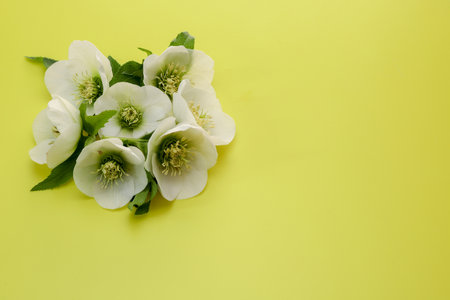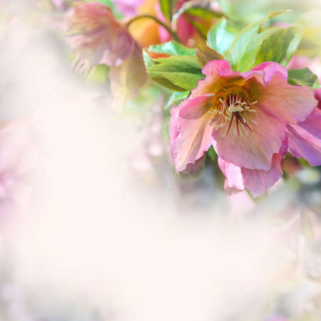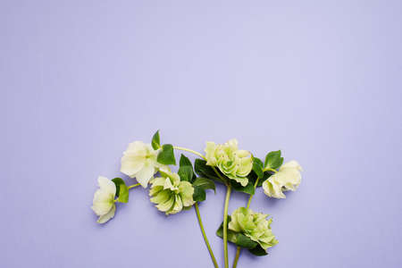 Spring blossoming hellebore flowers (lenten rose), floral flat lay feminine background. Easter and spring greeting card. woman day concept. spring banner. Copy space for text
