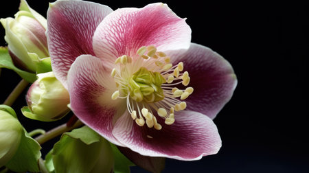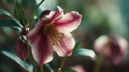Hellebore flower showcases intricate pink veining and delicate stamen detail.
