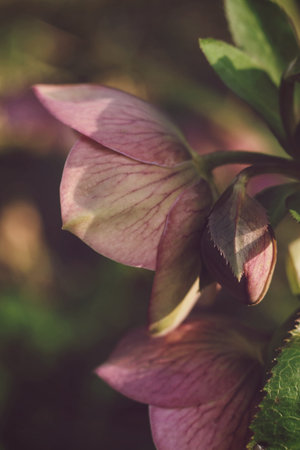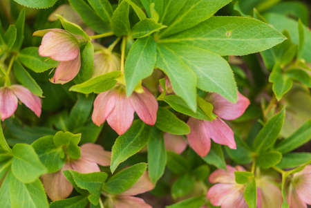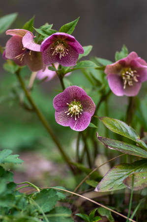 Helleborus purpurascens pink purple early spring flowering plant, beautiful flowers in bloom with green leaves