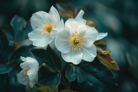 Delicate white flowers bloom vibrantly under warm sunlight showcasing natures beauty during the spring season.