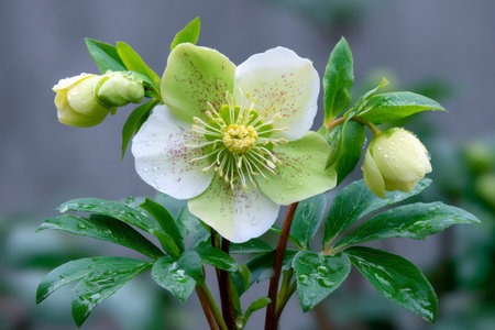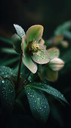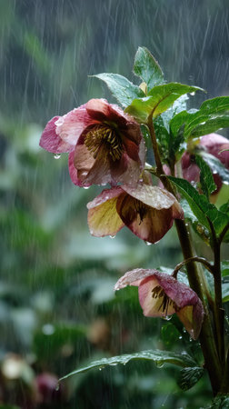Hellebore in a storm, heavy rain pouring down, strong winds twisting their leaves, natural.