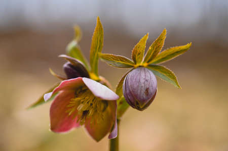 Early spring forest blooms hellebores, Helleborus purpurascens. Purple wildflower in nature. Hellebore macro details cose up.