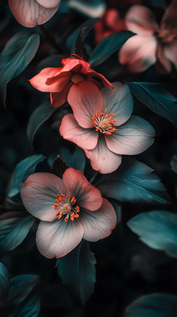 Intimate portrait captures Hellebore flowers with muted coral and pale pink petals, against a backdrop of dark teal leaves. Soft, ethereal botanical art piece.