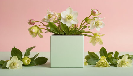 A studio still life featuring a potted hellebore plant with delicate white blooms and green leaves. The plant is housed in a minimalist mint green square pot, placed against a soft, pastel pink background. Several individual hellebore flowers and buds are arranged around the base of the pot, adding depth and symmetry to the composition. The lighting is soft and diffused, highlighting the delicate textures of the petals and leaves.